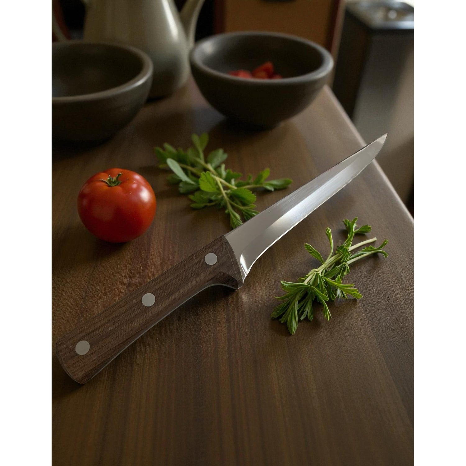 Acest cutit de macelarie este un instrument esential pentru orice bucatar, macelar sau pasionat de gatit care cauta precizie si durabilitate. Conceput pentru transarea, portionarea si prelucrarea carnii, cutitul combina un design robust cu un aspect traditional.