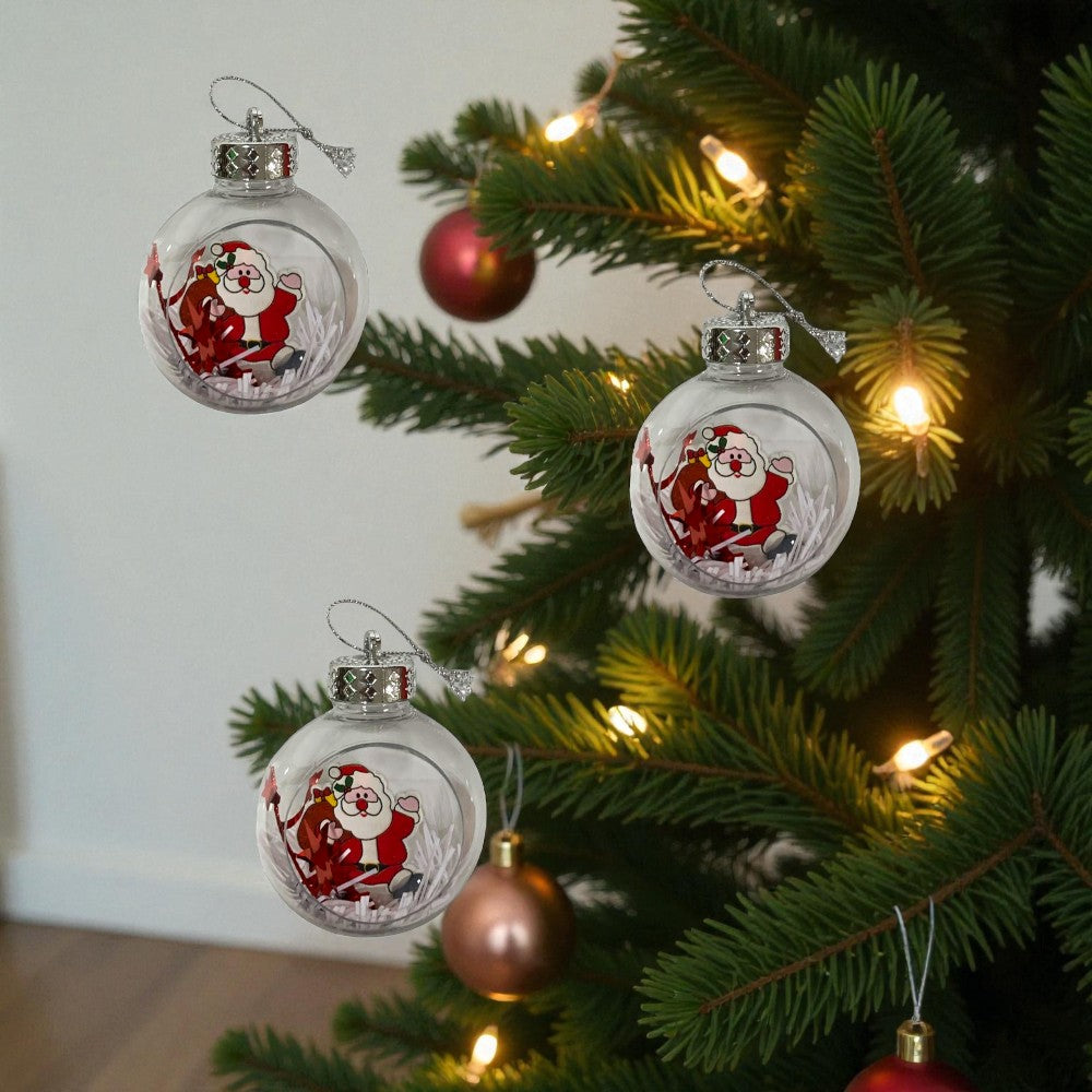 Un farmec aparte al acestor globuri este dat de particulele sclipitoare din care sunt formate stelutele, particule ce reproduc impresionant stralucirea zapezii, dar si de amplasarea unui Mos Craciun rotofei, autentic, ce zambeste cu pofta si parca indeamna la voie buna.