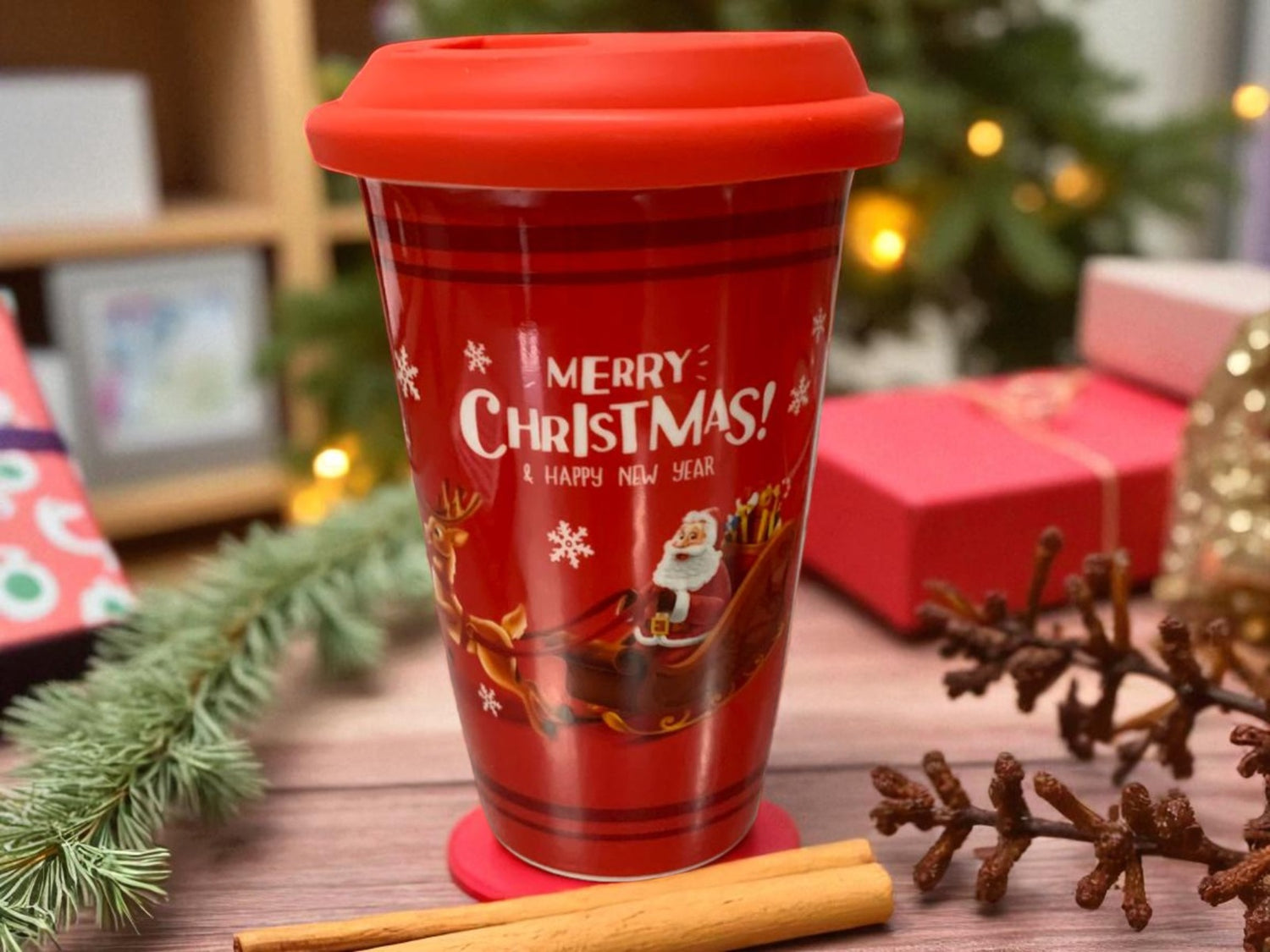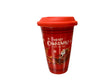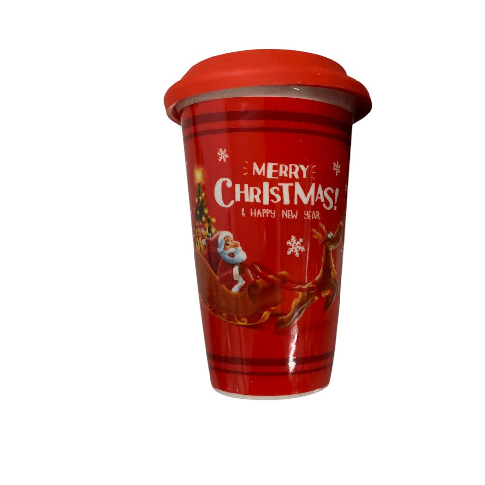 Pahar Ceramic cu Capac Silicon tip Termos, in cutie, Model Mos Craciun