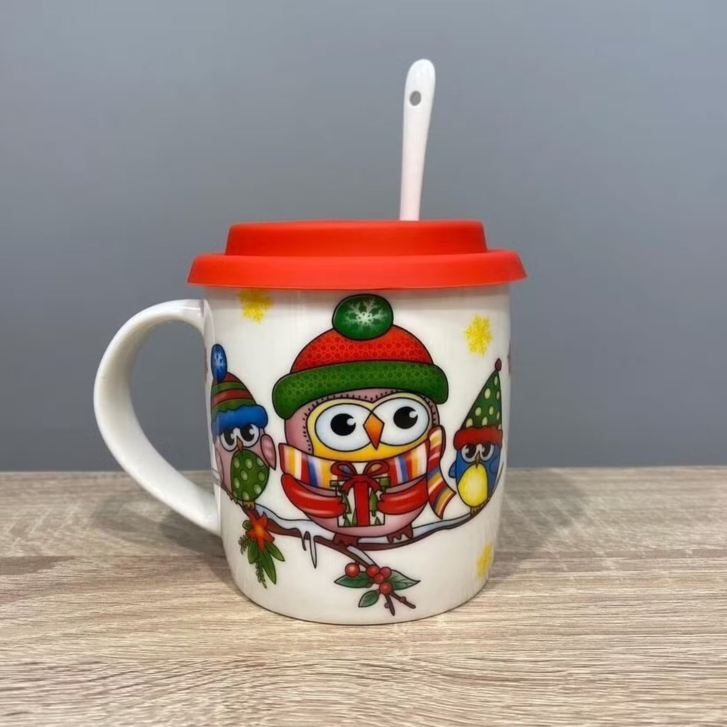 Cana ceramica model Bufnita cu capac silicon si lingurita ,370 ml