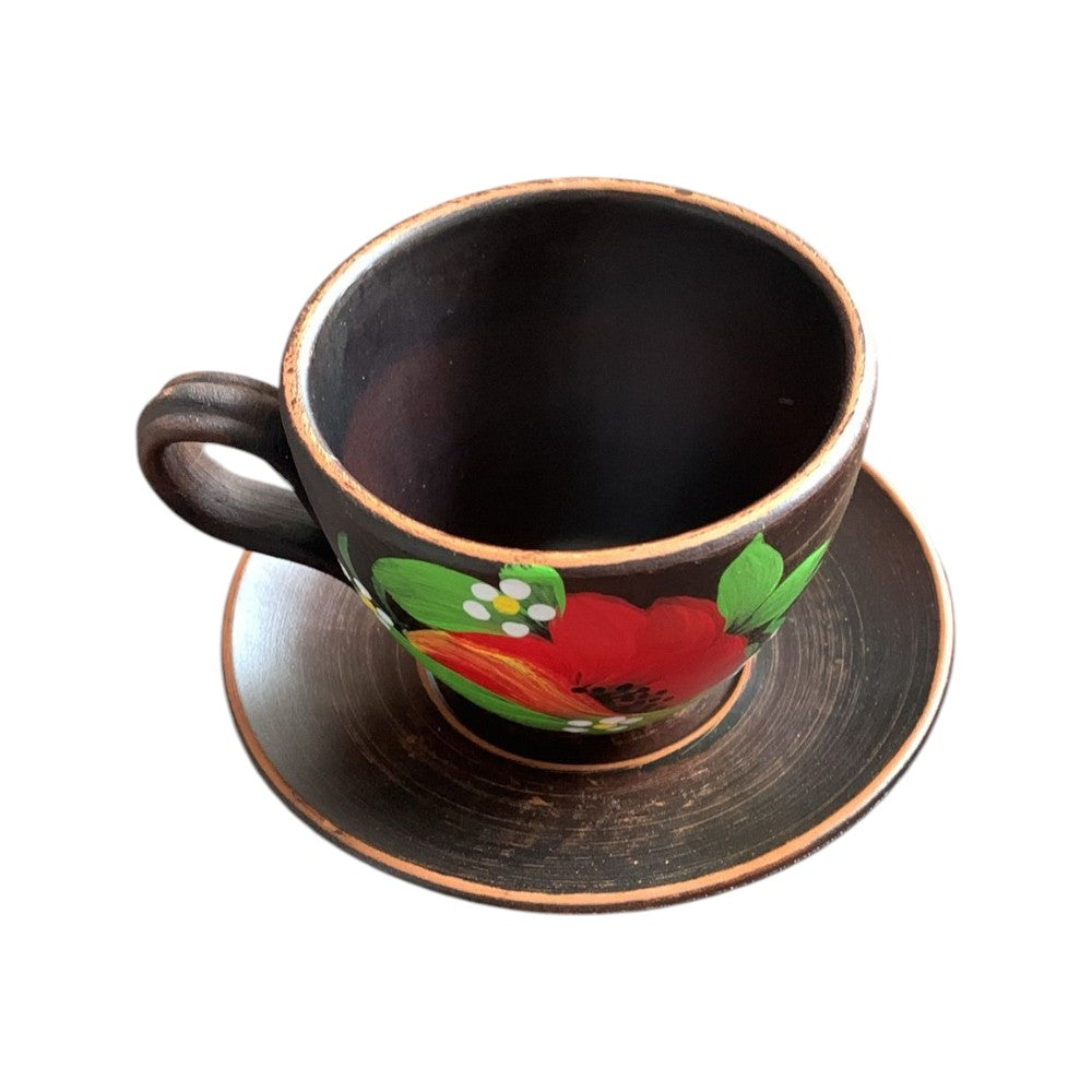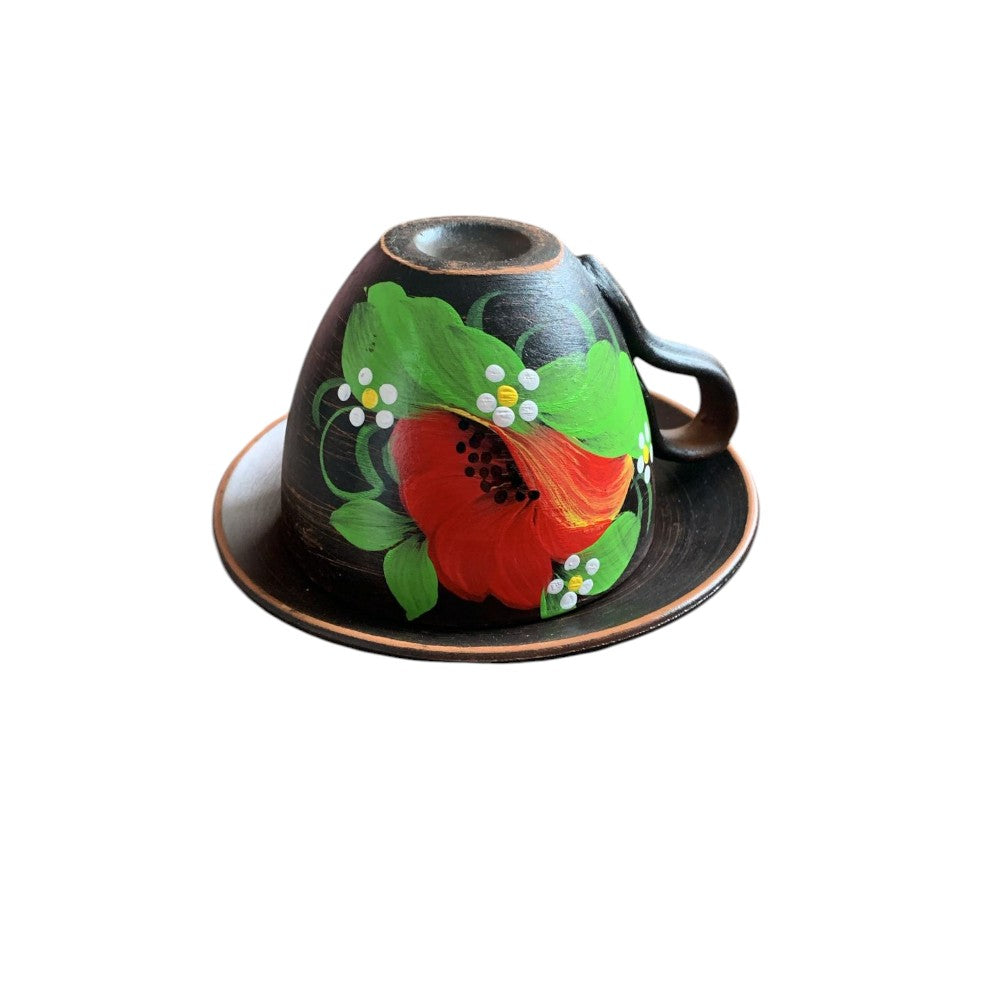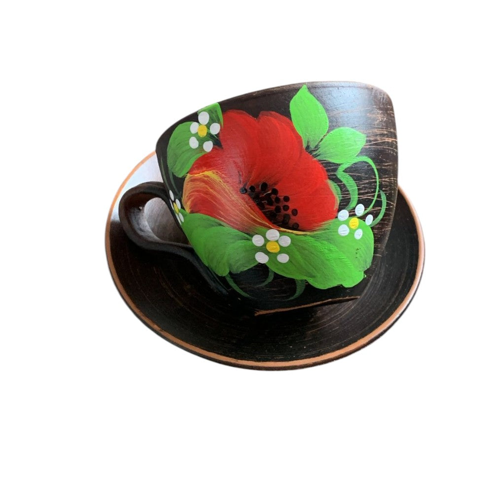 O ceașcă din lut roșu pictată cu model floral și însoțită de o farfurioară este un set de ceramică tradițională, realizat din lut de culoare roșie.