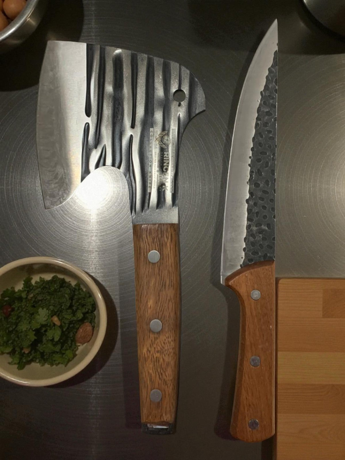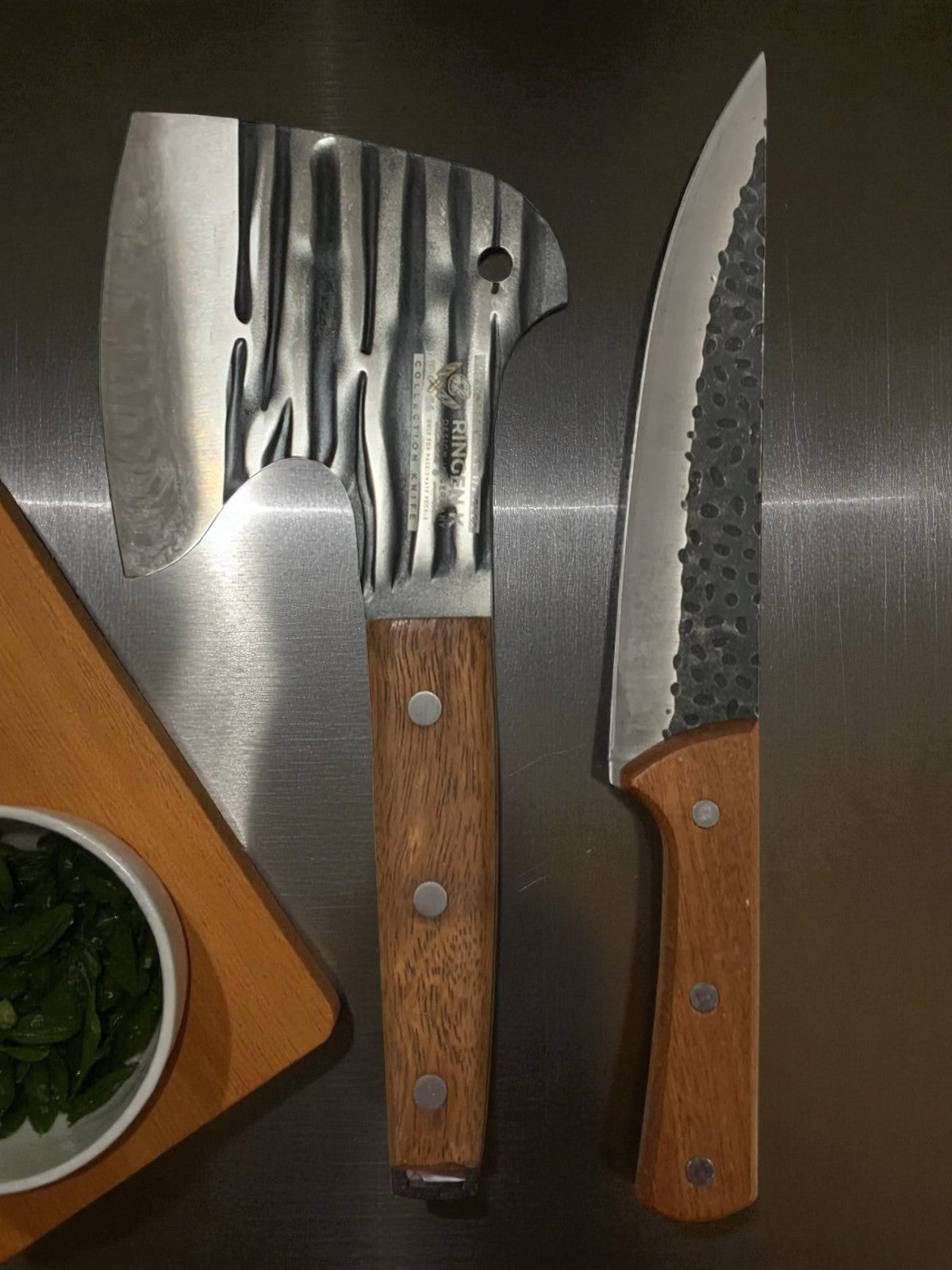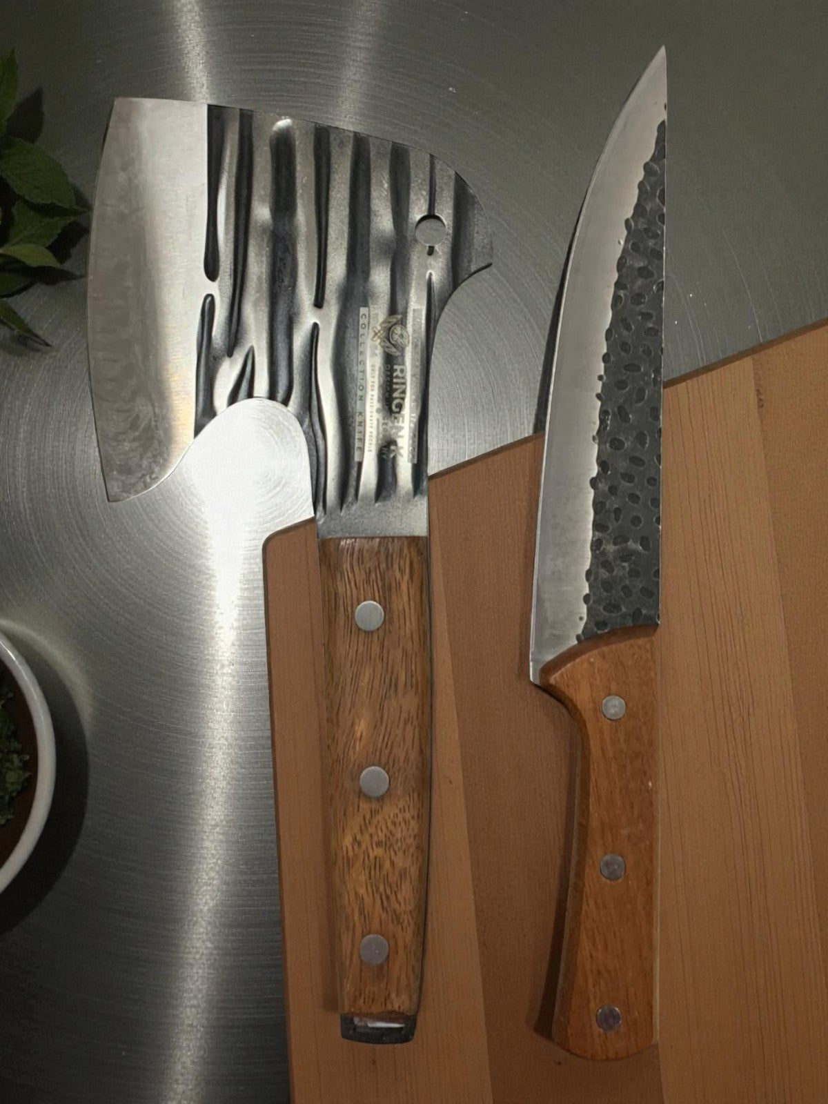 Manerele sunt concepute pentru a fi ergonomice si pentru prindere sigura, mai ales cand lucram cu carne — un manere din lemn sau ABS ajuta la un control bun si la reducerea alunecarii.
